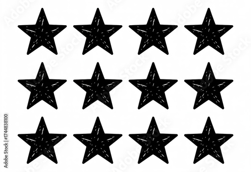 A set of twelve black stars arranged in three rows of four, perfect for various design and educational purposes