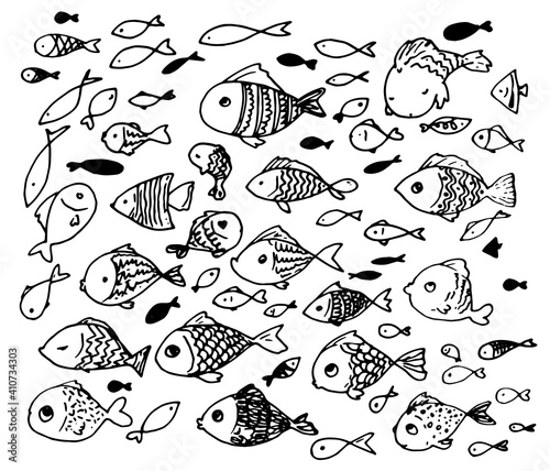 A set of vector stylized fish with rounded heads with black lines of patterns on a white background, swimming in different directions . A collection of aquarium fish and silhouettes drawn by hand in t