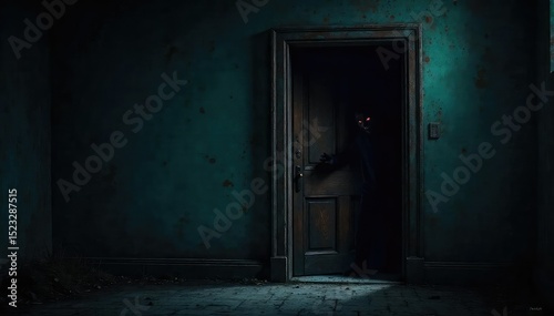 A shadowy figure lurking behind a creepy, old door, ready to jump out and scare; a classic horror scene perfect for Halloween or thriller projects , hidden, mysterious, mystery