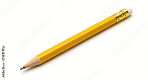 A sharpened yellow pencil with a white eraser lies on a white background, ready for writing, drawing, or sketching.