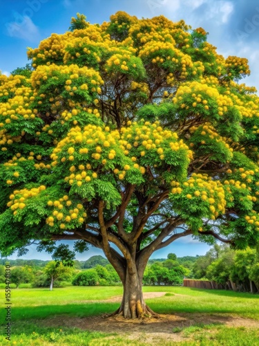 A Shea Tree in full bloom with vibrant green leaves and yellow flowers surrounding its trunk