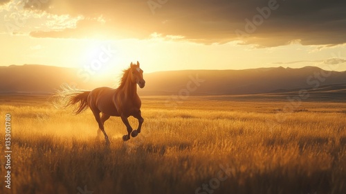 A shining copper-colored horse running across the open grassland with great speed