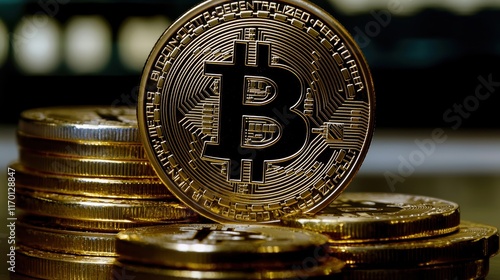 A shiny Bitcoin stands prominently among stacks of coins, symbolizing digital currency and investment in the cryptocurrency market.