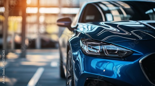 A shiny blue car parked in a parking lot, showcasing its sleek paint job.