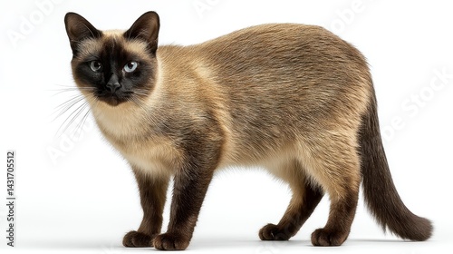 A Siamese cat with striking blue eyes stands gracefully, showcasing its unique coat pattern and sleek body.