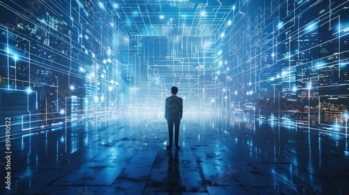 digital, earth, futuristic, man, technology, network, datum, information, future, progress, innovation, science, cyberspace, artificial, intelligence, ai, virtual, reality, ar, machine, learning, milliliter, cloud, computing, cyberspace, of, thing, big, coding, software, hardware, human, standing, silhouette, abstract, line, design, graphic, blue, dark, background, light, floor, glowing