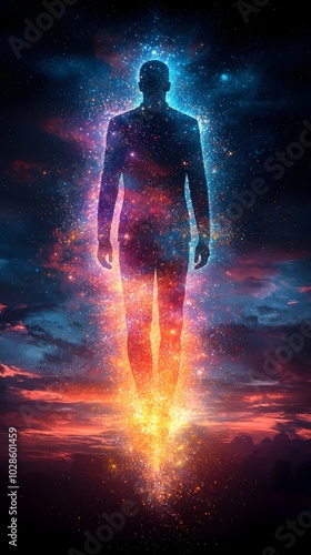 galaxy, cosmos, universe, man, silhouette, digital artwork, space, star, nebula, astronomy, science fiction, fantasy, surreal, abstract, cosmic, mystical, spiritual, exploration, journey, light, colours, glowing, dark, dramatic, sky, sunset, planet, space exploration