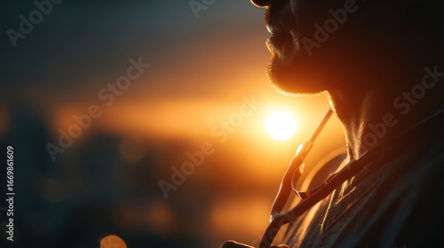 A silhouette of a person with a stethoscope at sunset, symbolizing healthcare and dedication in a serene environment.