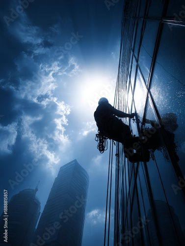 city landscape, silhouette, construction, urban, skyscraper, sun, cloud, men at work, labourer, harness, rope, glasses, facades, cleaning, maintenance, industry, occupation, job, daytime, sunny, architecture, metropolitan, downtown, vertical, photo, professional, exterior, wall, climber, ascent, descent, danger, risk, adventure, action, human, person