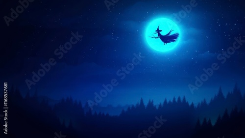 A silhouette of a witch flying on a broomstick against a large, glowing blue moon, surrounded by a tranquil night sky and dark forest.