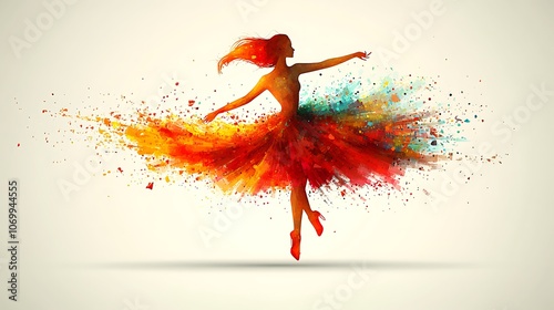 A silhouette of a woman in a colorful dress with paint splatter effect, against a white background.