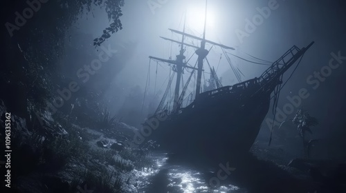 ship, silhouette, water, mist, moon, light, fog, mystery, dark, abandoned, ocean, sea, wreck, nautical, maritime, boat, travel, adventure, explore, history, legend, danger, skittish, eerie, night, coastline, jungle, tropical, foliage, shadow, romantic, dramatic, nature, environment, landscape, photo, tour tourism, journey, dream, imagination, art, design, wallpaper, background, illustration, concept, graphic, image