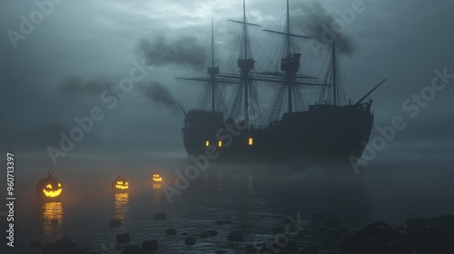 A Silhouetted Ship Sailing Through Fog With Glowing Jack-O'-Lanterns