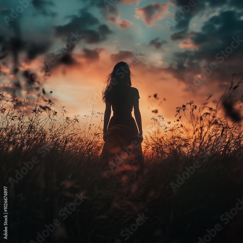 A silhouetted woman stands among grass against a captivating sunset, invoking mystery and contemplation.