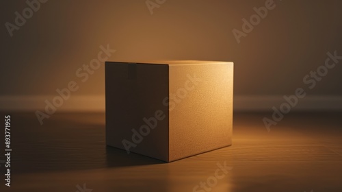 A simple cube-shaped box sits on a polished floor, softly illuminated by ambient light, creating a warm and serene atmosphere