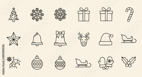 A simple line art concept illustration featuring a collection of Christmas holiday icons