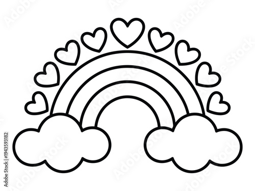 A simple line drawing of a rainbow with hearts and clouds