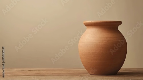 A simple, unadorned clay pot sits on a wooden surface, creating a warm and rustic aesthetic against a neutral background.