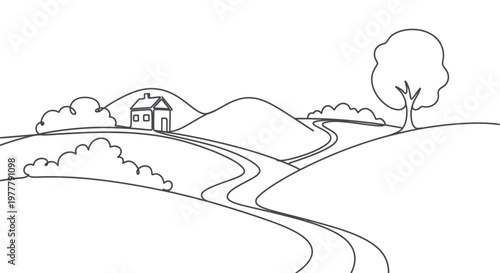 A simplistic, hand-drawn outline of a rolling landscape with a house, tree, and winding path