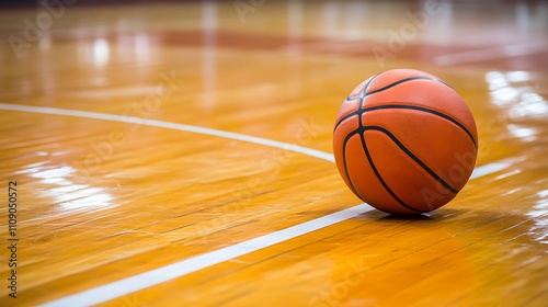 A single basketball rests on a polished hardwood court, ready for the next game.