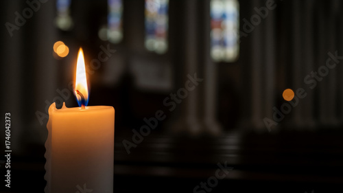 A single burning candle in a dark church for All Souls' Day. Spiritual concept of prayer, faith, and remembrance. Memorial vigil with copy space