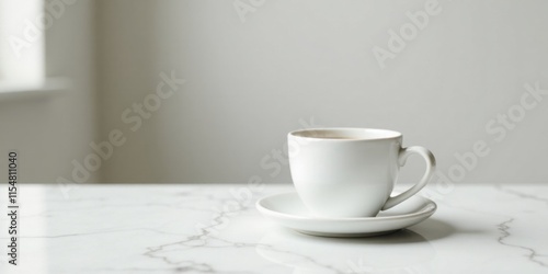A single cup of coffee rests on a pristine white marble surface, bathed in soft, diffused light
