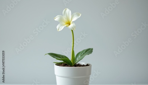 a single flower blooms in a small white pot, set against a neutral background