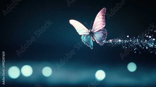 A single, glowing butterfly flutters through the air, leaving a trail of iridescent light in its wake as it navigates a surreal, dreamlike world.