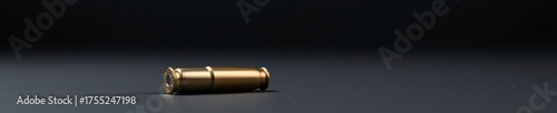 A single metallic bullet cartridge rests on a black backdrop, studio lighting, detailed, weapon part, ammunition