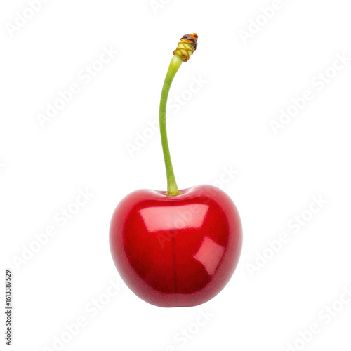 A single, perfectly ripe, glossy, vibrant red cherry with a healthy green stem, isolated on a pristine transparent background under bright studio lighting with no shadows, high angle macro. Concept of