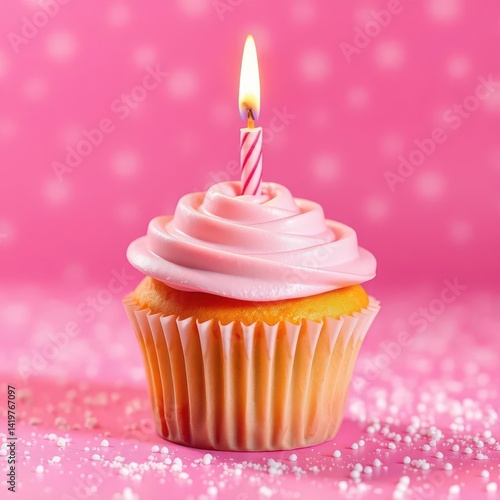 A single pink frosted cupcake with a lit candle, on a pink and white sparkly background, frosting, delicious, baking