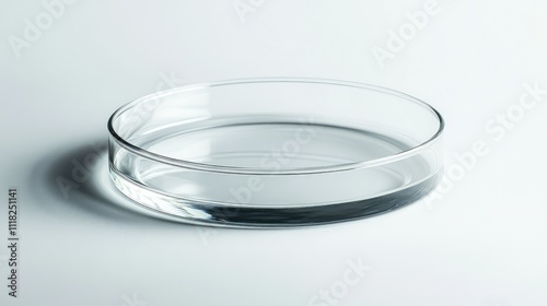 A single round petri dish viewed from the side, empty and clear, resting on a white background