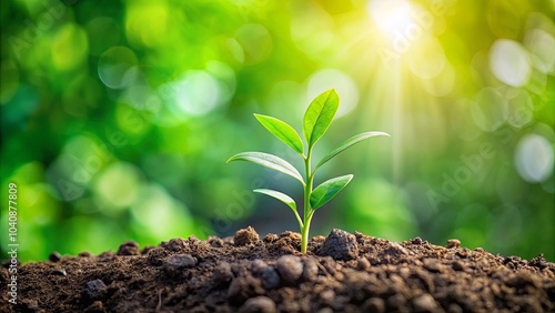 A single sprout emerges from the fertile soil, bathed in sunlight, symbolizing new life and growth against a backdrop of vibrant green foliage.