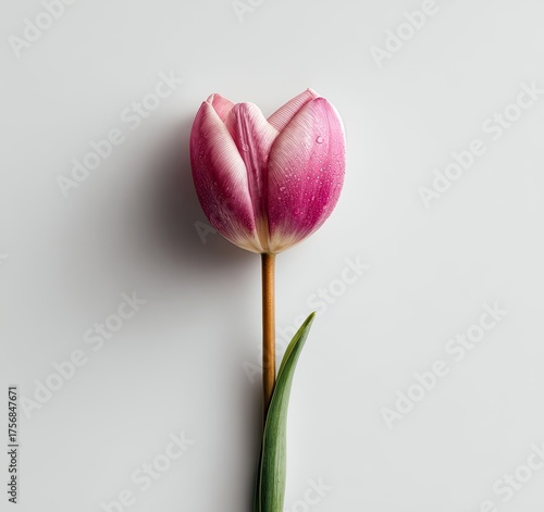 flower, pink, tulip, spring, bloom, blossom, flower petals, stem, leaf, green, white, isolated, beauty, delicate, nature, fresh, macro, closeup, vibrant, colours, botanical, elegance, garden, flora, growth, season, single, bright, detail, soft, natural, purity, simple, elegant, serene, peaceful, top, view, studio, composition, horizontal, minimal, light, shadow, freshness, plant, object, aesthetic, arrangement