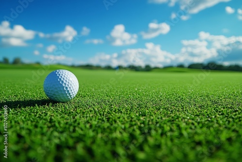 golf, ball, white, green, grass, fairway, sky, cloud, blue, sport, game, competition, leisure, recreation, outdoors, nature, summer, field, ground, round, dimple, tee, putter, club, swing, hole, score, championship, tournament, victory, challenge, strategy, concentration, accuracy, precision, fun, hobby, relaxing, healthy, lifestyle, fitness, active, professional, amateur, course, landscape, horizon