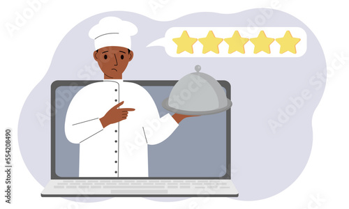 online, service, cook, laptop, computer, website, application, order, rating, review, vector, food, chef, technology, star, eatery, delivery, man, waiter, purchase, hand, hold, fast food, tray, cover, plate, flat, illustration, fast, business, store, app, african, black, mestizo, communication, retail, commerce, e-business, icon, delicious, cookery, design