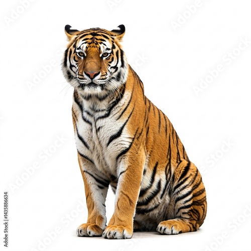 bengal tiger, sitting, animal, wildlife, felino, predator, carnivore, mammal, big cat, striped, orange, black, white, isolated, white background, studio shot, nobody, single, majestic, powerful, wild