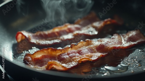 A sizzling, golden strip of bacon in a hot pan, surrounded by the natural smoke and grease, with soft lighting highlighting its crispy edges and texture