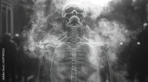 skeleton, smoke, bone, skull, ghostly, haze, fog, death, vapour, fume, grey, monochrome, black, white, dark, shadow, city, urban, street, figure, human, anatomy, body, spectral, aethereal, mysterious, enigmatic, morbid, creepy, gothic, abstract, surreal, art, artistic, photo, image, visual, graphic, concept, composition