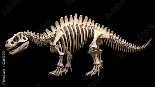 A skeleton of a dinosaur is shown on a black background