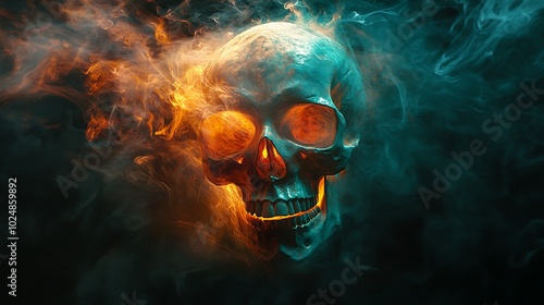 skull, graffiti, smoke, colours, red, yellow, teal, swirling, form, mirage, distortion, fluid, movement, dark, background, aethereal, effect, airbrush, technique, glowing, effect, saturation, realism, contrast, shadow, blending, hd, quality, natural, look, vibrant, radiant, surreal, dynamic, intense, high-coloured, bright, artistic, bold, aglow