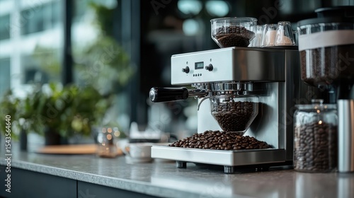 A sleek and modern coffee machine showcasing finely ground coffee beans, set against a stylish kitchen backdrop creating an inviting atmosphere for coffee lovers.
