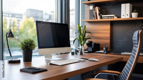home office, office, desk, computer, modern, workspace, work, desktop, interior, chair, monitor, lamp, organised, professional, business, ergonomic, plant, window, sleek, contemporary, furniture, technology, productivity, working, setup, clean, minimalist, stylish, equipment, room, tech, efficient, tidy, design, home, office supply, cosy, light, space, indoor, view, bright