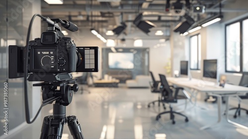 A sleek and modern media company office with cameras and satisfied clients