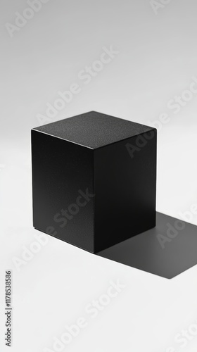A sleek black cube casting a sharp shadow on a white surface, showcasing minimalist design and modern aesthetics.
