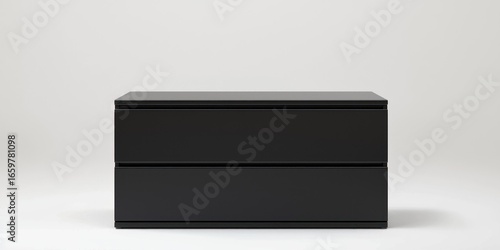 A sleek, black, two-drawer chest sits on a white surface. The chest has a minimalist design with clean lines and a flat top. The drawers are smoothly integrated into the body of the chest.