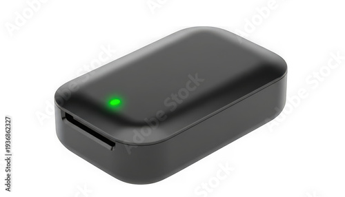 A sleek black wireless earbud charging case with a small green indicator light on transparent background