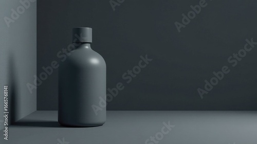 A sleek, dark gray bottle with a simple cap rests in a minimalist corner setting, showcasing its elegant design and clean lines against a muted background.