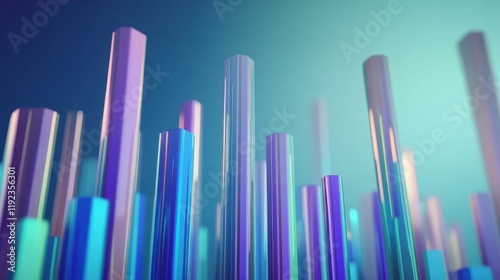 A sleek, D-rendered bar graph with tall, shiny bars in shades of blue and green, illustrating a rise in market data over a specified period