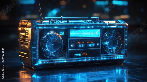 A sleek, futuristic take on a vintage boombox, with glowing blue accents and a retro sci-fi background